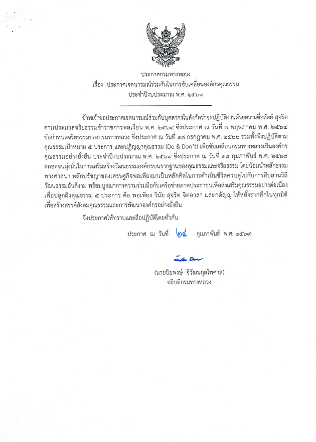 ประกาศกรมทางหลวง เรื่อง การประกาศเจตนารมณ์นโยบายไม่รับของขวัญและของกำนัลทุกชนิดจากการปฏิบัติหน้าที่(No Gift Policy) ประจำปีงบประมาณ พ.ส.2569
