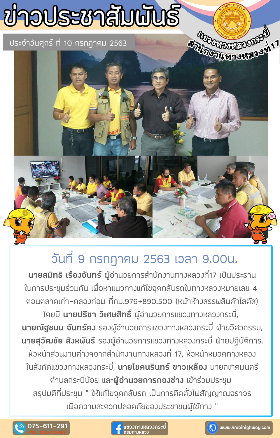 วันที่ 9 กรกฎาคม 2563 นายสมิทธิ เรืองจันทร์ ผู้อำนวยการสำนักงานทางหลวงที่17 เป็นประธาน ในการประชุมร่วมกัน เพื่อหาแนวทางแก้ไขจุดกลับรถในทางหลวงหมายเลข 4 ตอนตลาดเก่า-คลองท่อม ที่กม.976+890.500 (หน้าห้างสรรพสินค้าโลตัส) โดยมี นายปรีชา วิเศษสิทธิ์ ผู้อำนวยการแขวงทางหลวงกระบี่, นายณัฐชนน จันทร์คง รองผู้อำนวยการแขวงทางหลวงกระบี่ ฝ่ายวิศวกรรม, นายสุวัฒชัย สิงหพันธ์ รองผู้อำนวยการแขวงทางหลวงกระบี่ ฝ่ายปฏิบัติการ, หัวหน้าส่วนงานต่างๆจากสำนักงานทางหลวงที่ 17, หัวหน้าหมวดทางหลวง ในสังกัดแขวงทางหลวงกระบี่, นายโชคนรินทร์ ขาวเหลือง นายกเทศมนตรี ตำบลกระบี่น้อย และผู้อำนวยการกองช่าง เข้าร่วมประชุม
