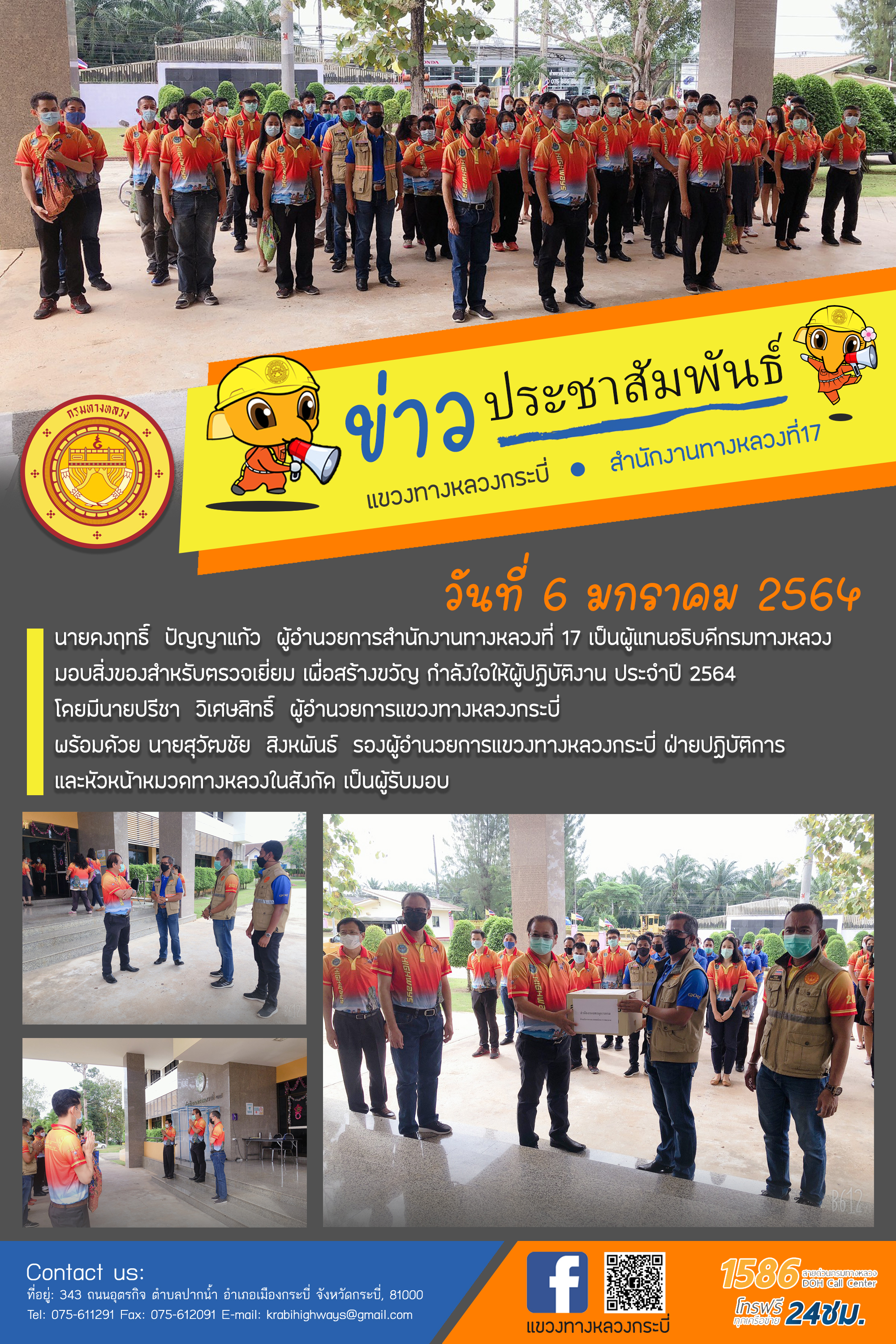 วันที่ 6 มกราคม 2564 นายคงฤทธิ์ ปัญญาแก้ว ผู้อำนวยการสำนักงานทางหลวงที่ 17 เป็นผู้แทนอธิบดีกรมทางหลวง มอบสิ่งของสำหรับตรวจเยี่ยม เพื่อสร้างขวัญ กำลังใจให้ผู้ปฏิบัติงาน ประจำปี 2564 โดยมีนายปรีชา วิเศษสิทธิ์ ผู้อำนวยการแขวงทางหลวงกระบี่ พร้อมด้วย นายสุวัฒชัย สิงหพันธ์ รองผู้อำนวยการแขวงทางหลวงกระบี่ ฝ่ายปฏิบัติการ และหัวหน้าหมวดทางหลวงในสังกัด เป็นผู้รับมอบ