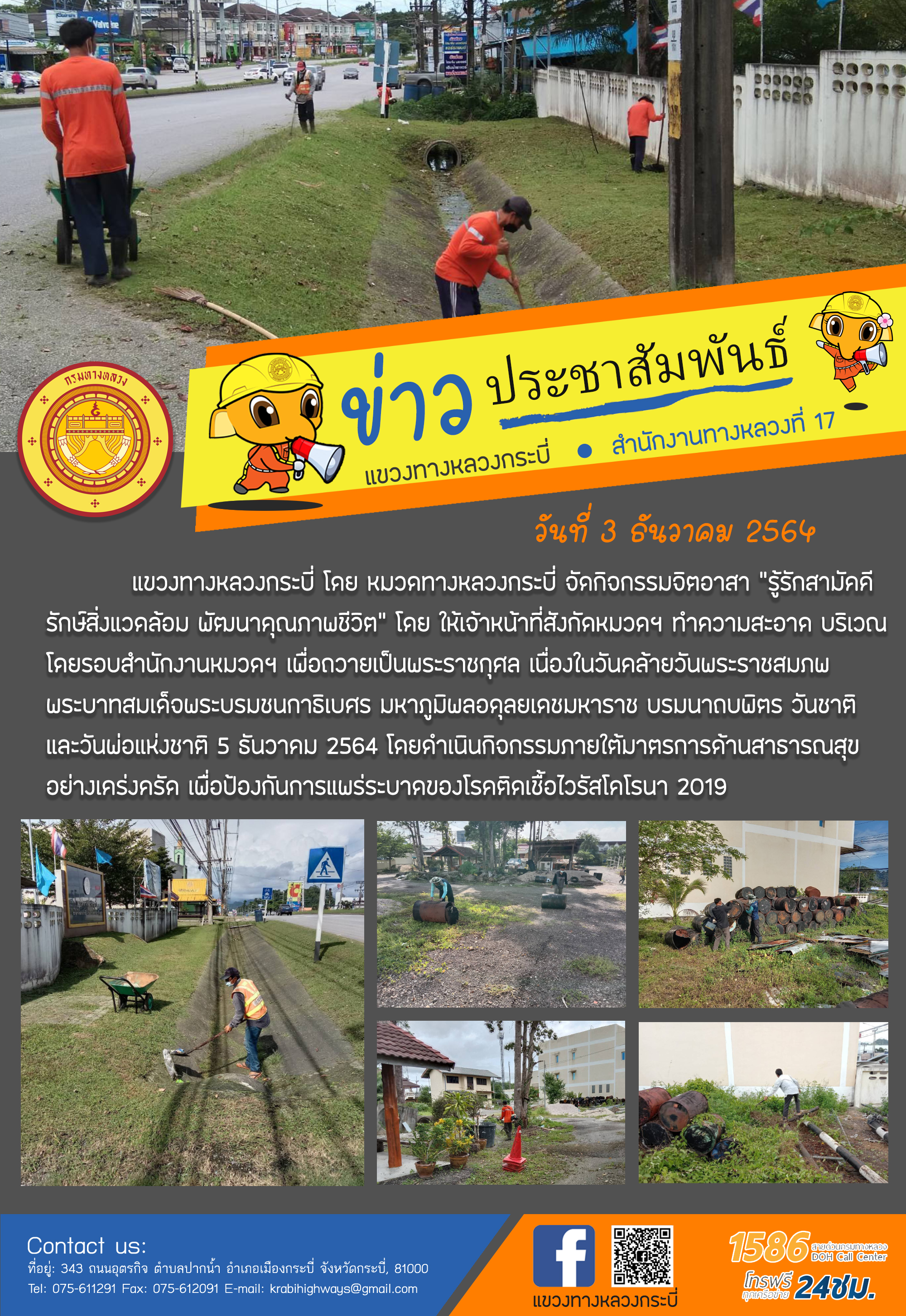 แขวงทางหลวงกระบี่ โดย หมวดทางหลวงกระบี่ จัดกิจกรรมจิตอาสา “รู้รักสามัคคี รักษ์สิ่งแวดล้อม พัฒนาคุณภาพชีวิต” โดย ให้เจ้าหน้าที่สังกัดหมวดฯ ทำความสะอาด บริเวณโดยรอบสำนักงานหมวดฯ เพื่อถวายเป็นพระราชกุศล เนื่องในวันคล้ายวันพระราชสมภพพระบาทสมเด็จพระบรมชนกาธิเบศร มหาภูมิพลอดุลยเดชมหาราช บรมนาถบพิตร วันชาติ และวันพ่อแห่งชาติ 5 ธันวาคม 2564 โดยดำเนินกิจกรรมภายใต้มาตรการด้านสาธารณสุข อย่างเคร่งครัด เพื่อป้องกันการแพร่ระบาดของโรคติดเชื้อไวรัสโคโรนา 2019